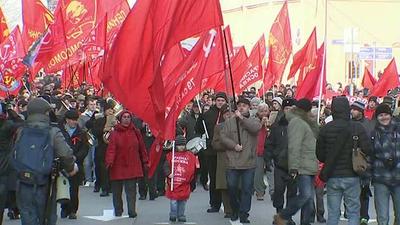 Самая массовая демонстрация КПРФ состоялась в Москве. Сначала колонна с красными флагами прошла по центральным улицам. Потом руководители партии и активисты выступили на митинге на Театральной площади.