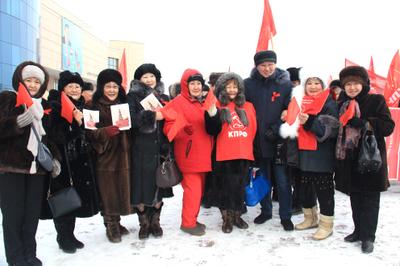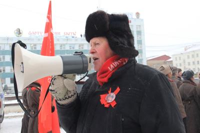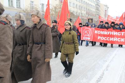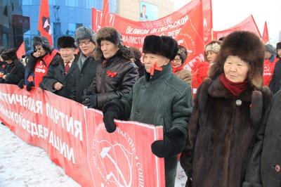 В Якутске 7 ноября состоялись демонстрация и митинг, в которых приняли участия около трех тысяч горожан и гостей столицы республики. На митинге с пламенными речами выступили первый секретарь Якутского рескома КПРФ Виктор Губарев, член бюро Якутского рескома КПРФ Артур Алексеев, народный писатель Якутии Андрей Кривошапкин, депутат Ил Тумэна Петр Аммосов, первый секретарь Якутского горкома КПРФ Саргылана Гоголева и другие.