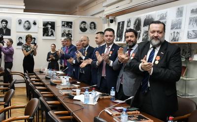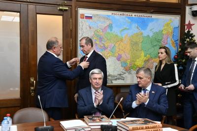 Затем состоялось награждение депутатов-коммунистов памятными медалями ЦК КПРФ в честь 140-летия И.В. Сталина. Среди награжденных – первый заместитель Председателя ЦК КПРФ И.И. Мельников, заместитель Председателя ЦК КПРФ В.И. Кашин, а также член Президиума ЦК КПРФ, экс-губернатор Иркутской области С.Г. Левченко.