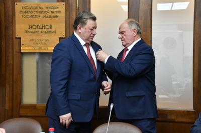 В свою очередь, И.И. Мельников вручил памятную награду Председателю ЦК КПРФ, Руководителю фракции КПРФ в Госдуме Г.А. Зюганову.