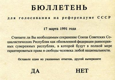 «Исходя из того, что никто, кроме самого народа, не может взять на себя историческую ответственность за судьбу Союза ССР, во исполнение решения четвёртого Съезда народных депутатов СССР и в соответствии с законодательством о референдуме СССР» 16 января 1991 года Верховный Совет СССР постановил провести на всей территории Советского Союза 17 марта 1991 года референдум, в рамках которого призвал задать гражданам следующий вопрос: