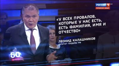 Выступая 20 июня в телепередаче «60 минут, по горячим следам прямой линии президента Российской Федерации», депутат-коммунист Леонид Калашников подчеркнул, что многие проблемы страны вызваны вполне очевидными ошибками правительства. В этой связи он напомнил о своем вопросе главе правительства России Дмитрию Медведеву при утверждении его в этой должности о проблемах правительственного ведомства Россотрудничества. При этом депутат-коммунист подчеркнул, что, как в свое время выразился один из руководителей советского государства, у каждой катастрофы есть фамилия имя и отчество. Но ответственности чиновников за провалы работы как не было, так и нет. Например, заговорили об огромной проблеме утилизации отходов. Но дело подается таким образом, будто эта проблема возникла только два года назад. Но ведь на самом деле она возникла уже давно вместе с крупными изменениями в технологиях. Надо было этим заниматься много лет назад.