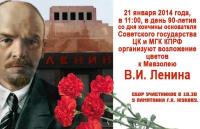 21 января 2014 года, в 11:00 ЦК и МГК КПРФ организуют возложение цветов к Мавзолею В.И. Ленина