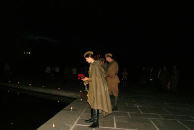 У подножия скульптуры «Родина-мать зовет», ровно в 4 утра, в час, когда на советские города упали первые вражеские бомбы,участники пробега почтили память павших минутой молчания и поставили зажженные свечи. Затем они вместе с активистами патриотического клуба «Пехотинец» зажгли свечи и возложили цветы у скульптуры «Скорбящая мать».