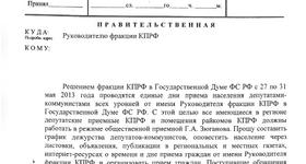 Прошу составить график дежурства депутатов-коммунистов, оповестить население через листовки, объявления, публикации в региональных и местных газетах, интернет-ресурсах о времени и дне приема граждан от имени Руководителя фракции КПРФ и организовать прием граждан.