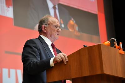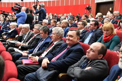 Затем слово было предоставлено лидеру КПРФ Г.А. Зюганову. Он выступил с основным докладом: «Защита социально-экономических прав трудящихся – важнейшее условие целостности страны и ее национальной безопасности».