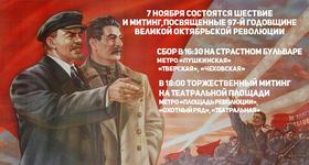 7 ноября 2014 года в Москве состоятся шествие и митинг, организуемые ЦК КПРФ и МГК КПРФ и посвященные 97-й годовщине Великой Октябрьской социалистической революции.