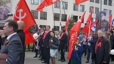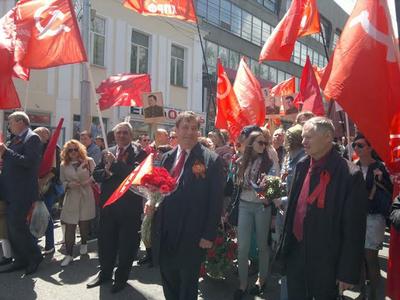Коммунисты со Знамёнами Победы, флагами СССР и партийной символикой, в отличие от колонн других партий, пели военные песни и славили героев-победителей речевками, лозунгами и криками «ура!!!».Стоит, однако, заметить, что колонна ЕР отличилась наличием Знамен Победы в своих рядах.