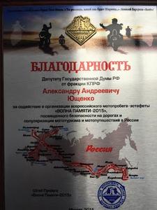 Депутату Государственной Думы, Руководителю Пресс-службы ЦК КПРФ Александру Андреевичу Ющенко была вручена благодарность за содействие в организации всероссийского автопробега-эстафеты "Волна памяти - 2015".