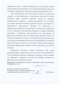 Поддерживая ходатайство адвоката Аграновского Д.В., прошу рассмотреть вопрос о возможности изучения уголовного дела Аракчеева С.В. с учётом доводов, изложенных в обращении, на предмет наличия оснований для обращения в надзорную инстанцию для проверки законности и обоснованности вынесенного приговора.