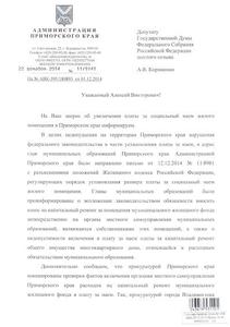 Алексей Корниенко обратился к губернатору Приморского края Владимиру Миклушевскому и прокуратуру с просьбой остановить незаконные сборы платежей с населения. Администрация Приморского края сообщила, что в декабре направила главам муниципальных образований разъясняющую информацию.
