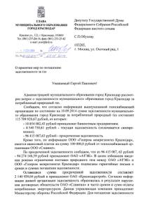 По информации краснодарского градоначальника, из этой суммы просроченная задолженность составила свыше 96 млн рублей. В числе крупных должников ОАО «Краснодарстрой», ОАО «АТЭК» и в том числе теплоснабжающая организация ООО «Славяне».