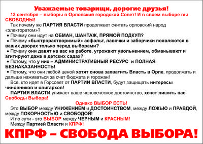 Орловский обком КПРФ к выборам 13 сентября 2015 выпустил листовку последнего дня "Красное и черное"