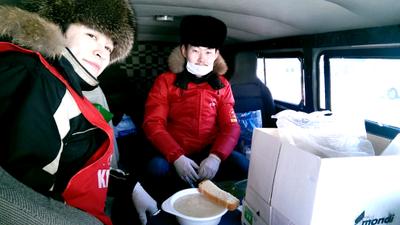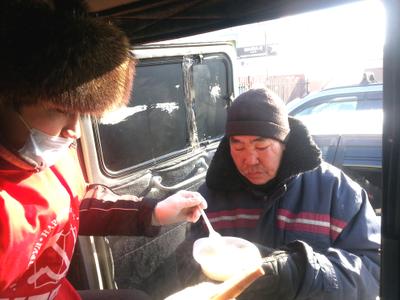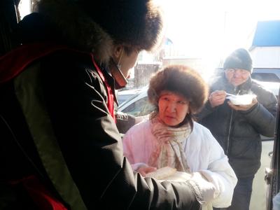 Первый день акции прошел в районе автовокзала. Мы накормили рисовой кашей с тушенкой, хлебом и чаем около 30-ти человек. Во второй день работали на рынке «Белое озеро», что недалеко от аэропорта «Якутск». Кроме горячего питания, всем своим клиентам раздали сухой паек и одежду — пальто, шапки, свитера, брюки, обувь и т.д., собранные горожанами в качестве гуманитарной помощи. В третий день акции мы действовали в районе Крытого рынка. В последний день провели рейд по городу.