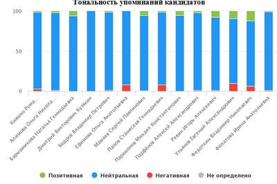 Анализ тональности упоминаний о кандидатах (гр.1) показывает, что наиболее позитивно упоминаются Н.Барышникова (Томская обл.), С.Мамаев (Кировская обл.), МюПарамонов (Ярославская обл.), И.Ревин (Калининградская область), Е.Ульянов (Карелия) и В.Федоткин (Рязанская обл.).