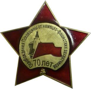 Постановлением Бюро Псковского обкома КПРФ от 16 января 2014 года утверждено Положение о памятном Знаке Псковского обкома КПРФ «В честь 70-летия освобождения Псковщины от немецко-фашистских захватчиков». На заседании Секретариата Псковского обкома КПРФ утвержден вид Памятного Знака. Его изготовление поручено Великолукскому ООО «АКВАВЕЛСЕРВИС», где генеральным директором работает член ЦКРК КПРФ, первый секретарь Великолукского городского комитета КПРФ Сергей Сосновский.