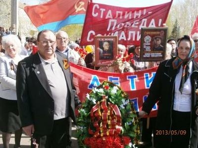 «Перед началом праздничного официального мероприятия, проходившего на центральной площади около администрации города, к нашей колонне подошел начальник полиции Роман Дьяков – и велел убрать один из лозунгов: «Сталин. Победа. Социализм». Сказал, что «лозунг – политический». Кроме него коммунисты и общественники держали еще растяжку «Детям войны – достойную жизнь» и портреты Сталина, Жукова, Рокоссовского.