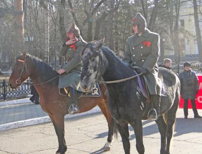 Несколько сотен людей собрались 7 ноября в Благовещенске на площади Победы под красными знаменами с транспарантами и цветами. По традиции колонну сопровождали украшенные автомобили, из которых звучала музыка и коммунистическиелозунги. Праздничную атмосферу помогал создавать духовой оркестр. Впервые на демонстрации в Благовещенске приняла участие кавалерийская группа. Внимание многих горожан было приковано к всадникам-красноармейцам в шинелях и буденовках времен Гражданской войны.
