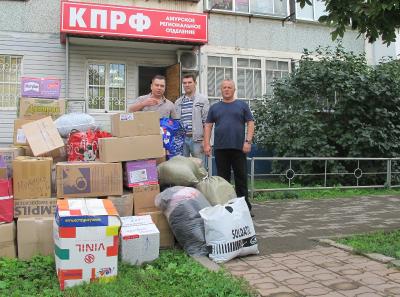 Полный вещей фургон отправился из Благовещенска в субботу 24 августа. Преодолев путь более 400 километров, партию помощи доставили в штаб по ЧС Архаринского района. Принял партию заместитель главы районной администрации Сергей Варкентин. Сопровождавший партию помощи из областного центра председатель контрольно-ревизионной комиссии Амурского областного отделения КПРФ Валерий Песенков и первый секретарь Архаринского райкома Леонид Молдованов осмотрели эвакуационные пункты в пгт. Архара, провели консультации с представителями местных властей, встретились с пострадавшими, составили план дальнейших действий в условиях ЧС.