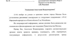 «15-16 ноября на улицах и проезжих частях города Москвы были установлены рекламные конструкции со следующим содержанием: «19.12 Народный корпоратив в Олимпийском Стаc Михайлов». По непроверенной информации, данная реклама была размещена как социальная и финансировалась при поддержке Правительства Москвы», - отмечается в депутатском запросе.