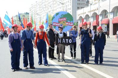 В руках демонстрантов были Красные знамена, флаги городов Юго-Востока Украины, а также Донецкой народной республики. Кроме того, участники шествия несли транспарант «Мир Ливии» и флаг Сирии.