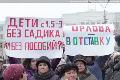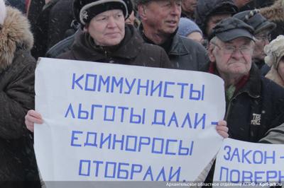 Возмущенные горожане потребовали отставки Правительства РФ и Правительство Архангельской области во главе с губернатором Игорем Орловым.Митинг, организованный КПРФ, собрал почти 2000 человек.
