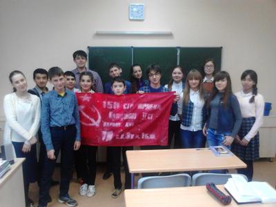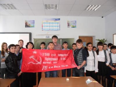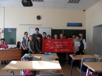 Знамя нашей Победы снова встречают с радушием в школах, говоря, что этот проект очень нужный и востребованный. Было проведено 7 уроков в школах №32 и №11. Хочется отметить, что общий уровень знаний школьников повысился, и на вопросы, на которые в прошлом году никто не мог ответить, сейчас отвечают без затруднений. Наверно это связано с работой школ по подготовке к 70-летию Победы.