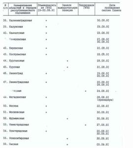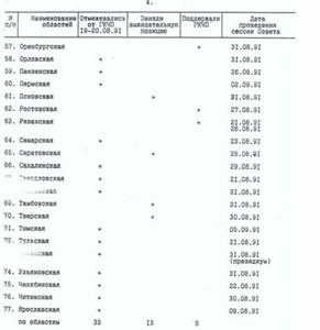 Изучение деятельности органов власти на местах, которое вел Президиум Верховного Совета РСФСР после августа 1991 года, подтверждало вывод о том, что поддержка действий Б.Н.Ельцина и тогдашнего руководства Верховного Совета РСФСР в регионах была весьма слабой. Соотношение сил было – половина на половину. В течение 19-20 августа против ГКЧП выступили 44 региональных Совета, а поддержали или заняли выжидательную позицию – 43.