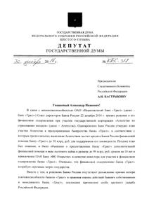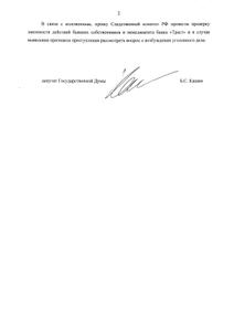 В связи с изложенным, прошу Следственный комитет РФ провести проверку законности действий бывших собственников и менеджмента банка «Траст» и в случае выявления признаков преступления рассмотреть вопрос о возбуждении уголовного дела.