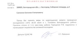Сергей Георгиевич Левченко, член Президиума ЦК КПРФ, первый секретарь Комитета Иркутского областного отделения КПРФ, депутат Государственной Думы РФ, будучи сам в это время на Всероссийской Байкальской школы комсомольского актива, немедленно отреагировал на произвол властей отправив правительственную телеграмму в адрес губернатора Белгородской области Е.С. Савченко с обращением по недопущению запрета проведения комсомольского слёта, указав, что причины отказа первым заместителем главы Белгородского района являются надуманными и ничем иным, как давлением на активную молодежь.