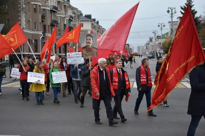 Праздничное шествие прошло по традиционному маршруту: проспект Ленина (ныне Гражданский) — ул. Попова — Диорама. Несмотря на будний день и осеннюю погоду, в мероприятии приняли участие около 400 человек. Комсомол, Союз советских офицеров, «Дети войны», созидательное движение «Русский Лад», «ВЖС - Надежда России» - каждый из участников праздничного шествия подготовил свои транспаранты. Принять участие в демонстрации приехали коммунисты из близлежащих районов: Ракитянского во главе с первым секретарем Анатолием Чесноковым, Шебекинского — с первым секретарем Владимиром Рудоманом. Также поддержать товарищей прибыли муниципальные депутаты и активисты Белгородского района.
