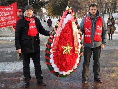 В честь 98-го Дня рождения Советской Армии и Военно-Морского Флота коммунисты, комсомольцы, жители Перми под военные марши и любимые военные песни возложили к постаменту легендарной «тридцатьчетвёрки» венок и алые гвоздики. Пикет предварил небольшой митинг.
