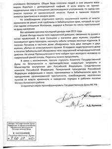 В связи с изложенным, просим поручить Комитету Государственной Думы по безопасности и противодействию коррупции запросить в Министерстве внутренних дел Российской Федерации, Следственном комитете Российской Федерации, Генеральной прокуратуре Российской Федерации информацию о мерах, принимаемых в Забайкальском крае по преодолению организованной преступности, освобождению населенных пунктов от власти криминала и наведению порядка в рабочем поселке Могзон Хилокского района.