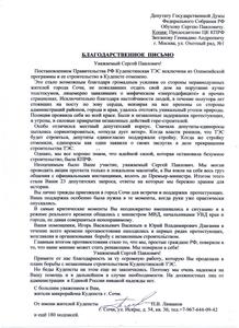 На имя депутата Госдумы от Краснодарского края (фракция КПРФ) С.П. Обухова пришло благодарственное письмо от жителей микрорайона Кудепста г. Сочи. Под письмом 180 подписей.