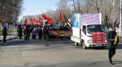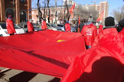 Несколько сотен коммунистов, комсомольцев и сторонников партии из Благовещенска и Благовещенского района вышли на центральную улицу под лозунги и призывы агитаторов КПРФ. Колонна с транспарантами и красными знаменами прошла от площади Победы до площади Ленина.