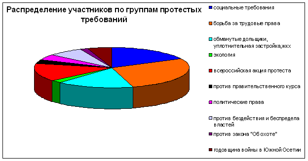 На первое место по числу участников вышли акции протеста рабочих, протестующих против невыплаты зарплаты. На втором и третьем местах находятся, соответственно, акции протеста с социальной тематикой и выступления обманутых дольщиков.