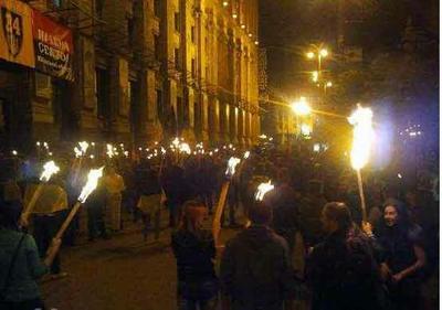 Толпа с факелами пыталась прорваться на Майдан и забрать себе реликвии, связанные с памятью "Небесной сотни". Их не пустили, на баррикадах началась жестокая драка между штурмовиками "Национал-социалистической Ассамблеи" и сотнями "Самообороны Майдана", сообщает портал "Русская весна".