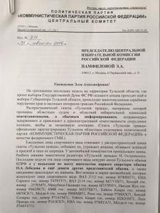 Центральная избирательная комиссия обратилась в Генеральную прокуратуру РФ по фактам давления на КПРФ в Тульской области, изложенным в письме Г.А. Зюганова