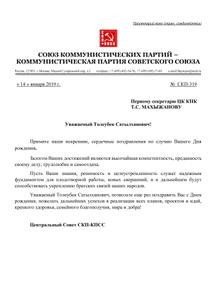 Центральный Совет СКП-КПСС поздравляет с Днем рождения Первого секретаря ЦК Компартии Казахстана Т.С. Махыжанова