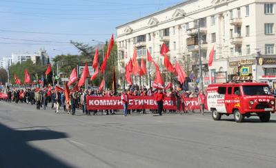 Первомай сегодня вновь стал в России днём борьбы. Борьбы за права трудящихся, за мир, свободу, равенство, дружбу и братство всех народов. Челябинские коммунисты и их сторонники в этот день традиционно провели демонстрацию и митинг. Под духовой оркестр, с Красными знамёнами, флагами и транспарантами их колонна прошла с места сбора на Алом поле по проспекту В.И. Ленина до памятника Вождю на площади Революции.