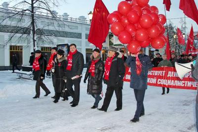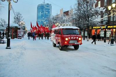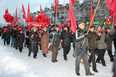 День 7 ноября – Красный день календаря, - праздник который не забыть, и никому не отменить! Это не под силу ни природе, ни капиталистам. Поэтому неожиданно выпавший снег и похолодание также не смутили коммунистов и их сторонников, как не смущают их попытки кремлёвских властей заменить этот праздник на непонятный «день единства и согласия».