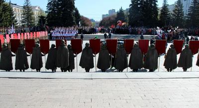 Неожиданно для собравшихся прогремел трёхкратный салют, и почётный караул, состоящий из курсантов военных институтов, чеканным шагом прошёл мимо Знамени Победы, которое гордо держали секретарь обкома КПРФ - Сергей Васильев и молодые челябинцы.