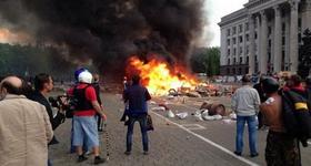 Украинские СМИ сообщали, что активные столкновения несколько утихли в центре Одессы, однако футбольные болельщики переместились на Куликово поле. Там они окружили и подожгли лагерь сторонников федерализации. Последние спрятались в местном Доме профсоюзов, они отстреливаются, однако в здании возник пожар.