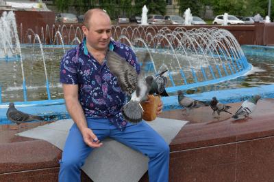 Пока люди протестуют, на фонтане сидит мужчина, в руках у которого белый батон хлеба. Стая голубей окружила его и кучей отрывает большие куски мякиша, бросая его птицам. Кажется, что он сидит здесь случайно, но нет — он говорит, что именно так он представляет решение повысить пенсионный возраст.