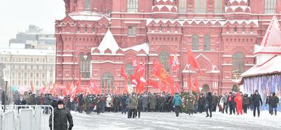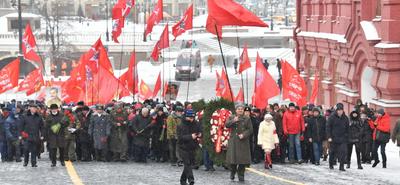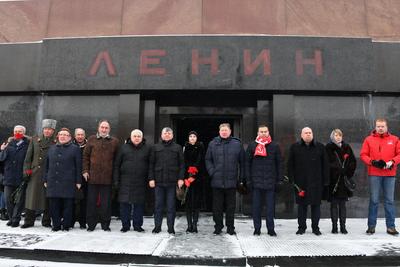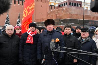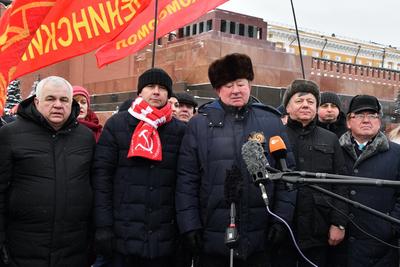 Колонну под красными знаменами возглавили первый заместитель Председателя ЦК КПРФ Ю.В. Афонин, заместители Председателя ЦК КПРФ В.И. Кашин и Д.Г. Новиков.