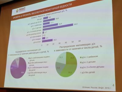 Уровень бедности среди семей с детьми более чем в два раза выше уровня бедности среди всего населения в целом. Более 50% семей с тремя и более детьми фактически находятся в нищете. Доля домохозяйств с детьми среди бедных домохозяйств составляет более 78%. По причине низкой адресности и небольшого размера, существующие сегодня детские и семейные пособия в целом сокращают бедность семей с детьми крайне незначительно, с 22,6% до 20,8%. Представителю Росстата пришлось немало попотеть, пытаясь слегка приукрасить такую неутешительную картину своими выкладками.