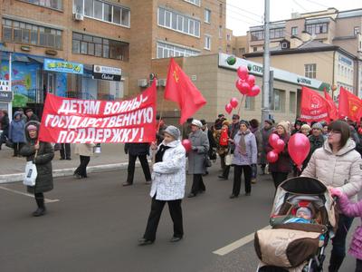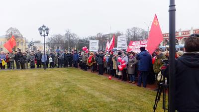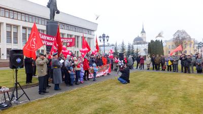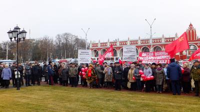 Утром 7 ноября на площади Победы под Красные знамена начали собираться коммунисты, комсомольцы и сторонники партии. Прибыли делегации от беженцев, размещённых под Калугой, от организации «Дети погибших защитников в годы Великой Отечественной войны». Духовой оркестр на площади исполнял советские и патриотические песни, звучали лозунги и призывы коммунистов в честь Великого Октября. Все поздравляли друг друга с праздником.