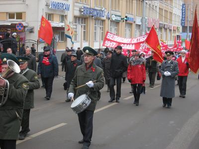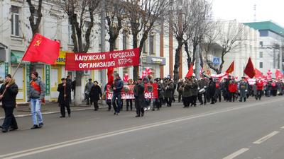 В честь 97-летия Великой октябрьской социалистической революции Калужским городским комитетом КПРФ совместно с Ленинским коммунистическим союзом молодежи, Движением в поддержку армии, организацией «Дети войны», советом рабочих и служащих города были проведены торжественное шествие и митинг.