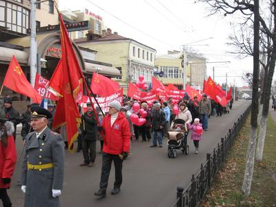 Коммунисты с алыми стягами и знаменами под военные марши духового оркестра проследовали колонной от площади Победы до площади Ленина. Участники шествия дружно пели советские песни, поздравляли калужан с праздником Великого Октября.
