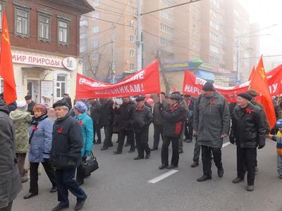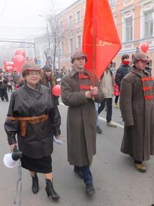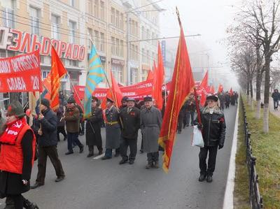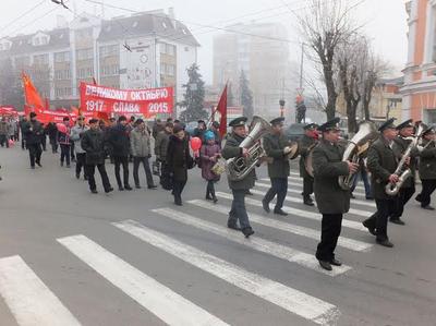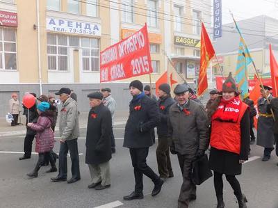 Коммунисты с алыми стягами и знаменами под военные марши духового оркестра проследовали колонной от площади Победы до площади Ленина. Участники шествия дружно пели советские песни, поздравляли калужан с праздником Великого Октября.